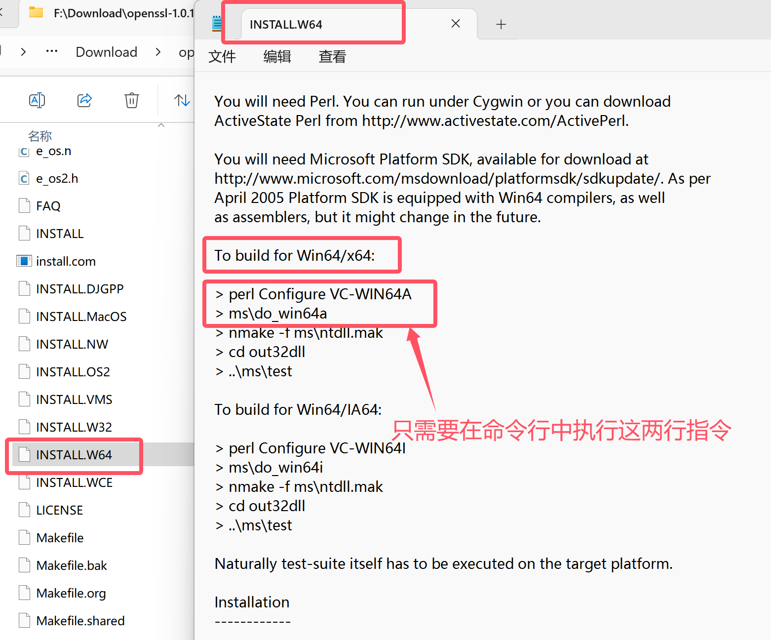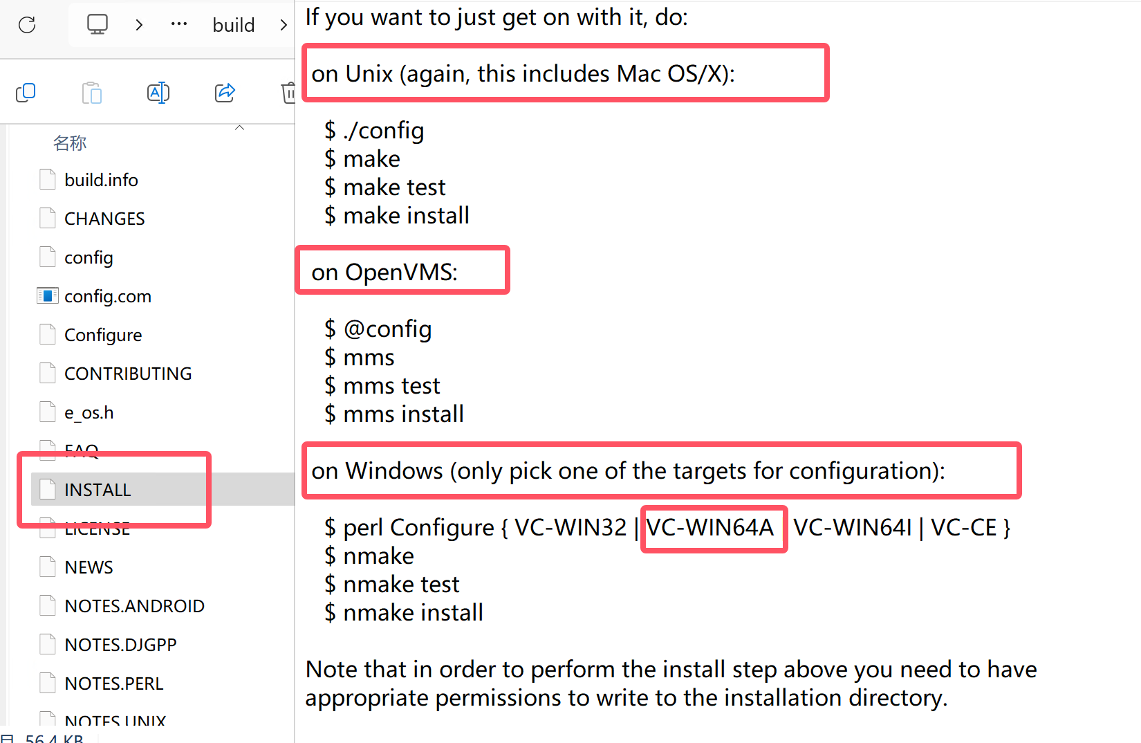 openssl-1.1.1j版本的根目录下找到INSTALL文件,用文本编辑器打开它,可以看到在各个系统上使用时需要运行的配置命令,我们这里是64位,所以需要在x64 Native Tools Command Prompt for VS 2022 命令行中切换到openssl的根目录,然后运行 perl Configure VC-WIN64A