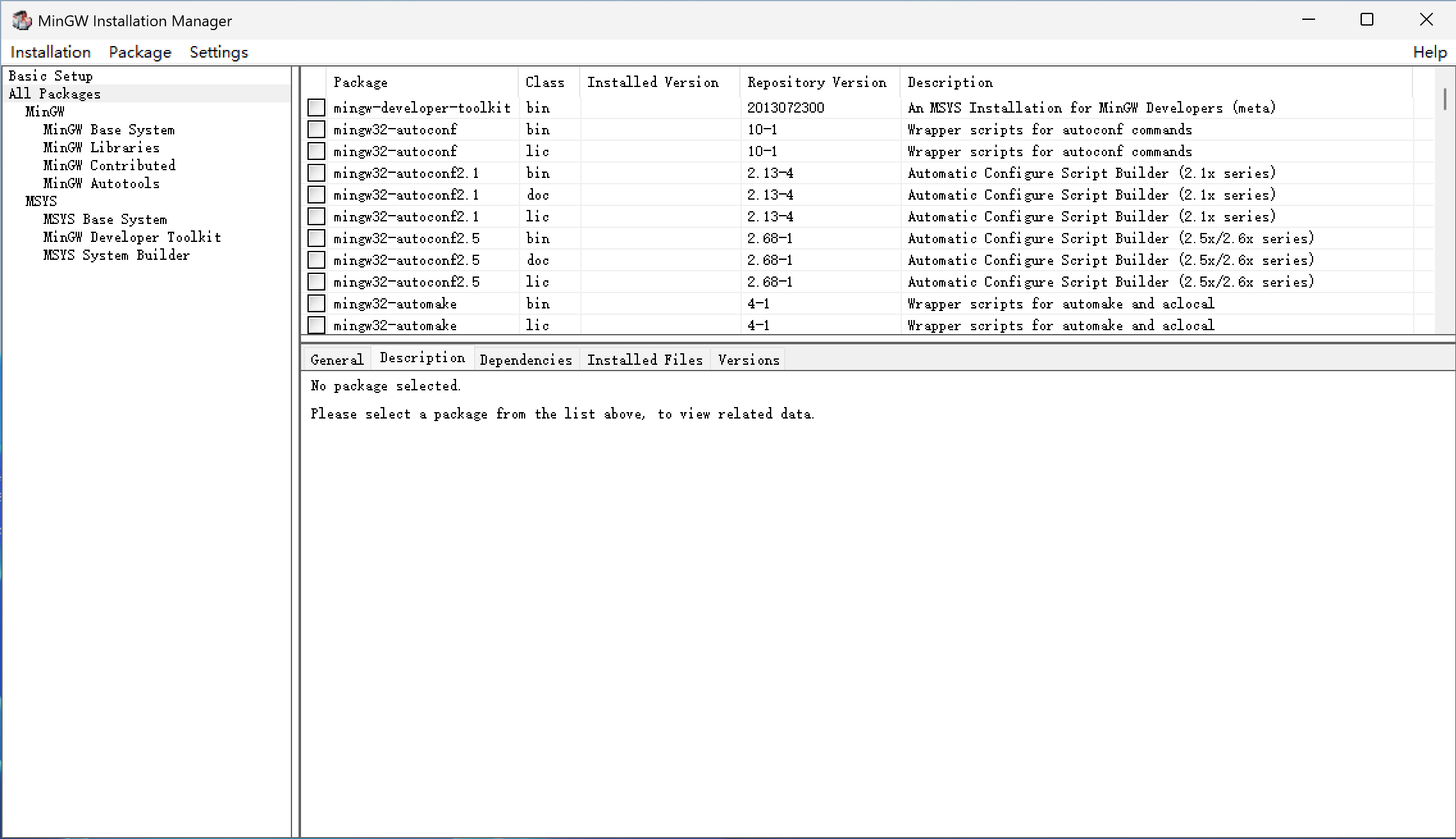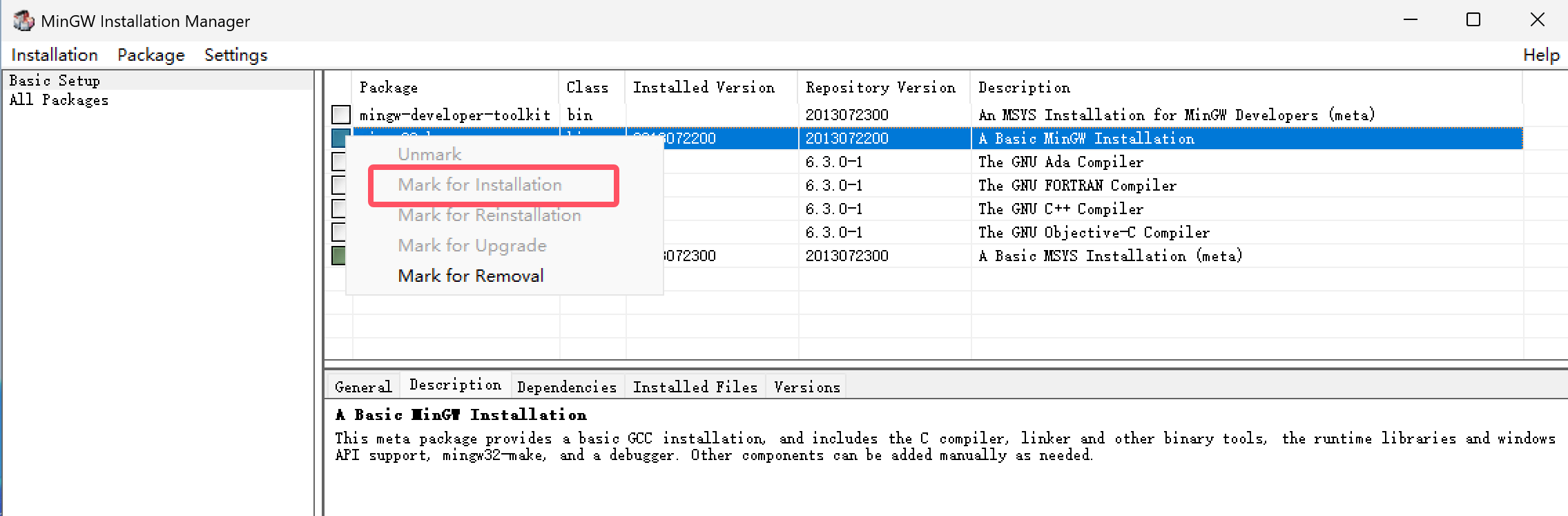 左侧菜单栏选择“Basic Setup”,然后勾选 “mingw32-base”和“msys-base”