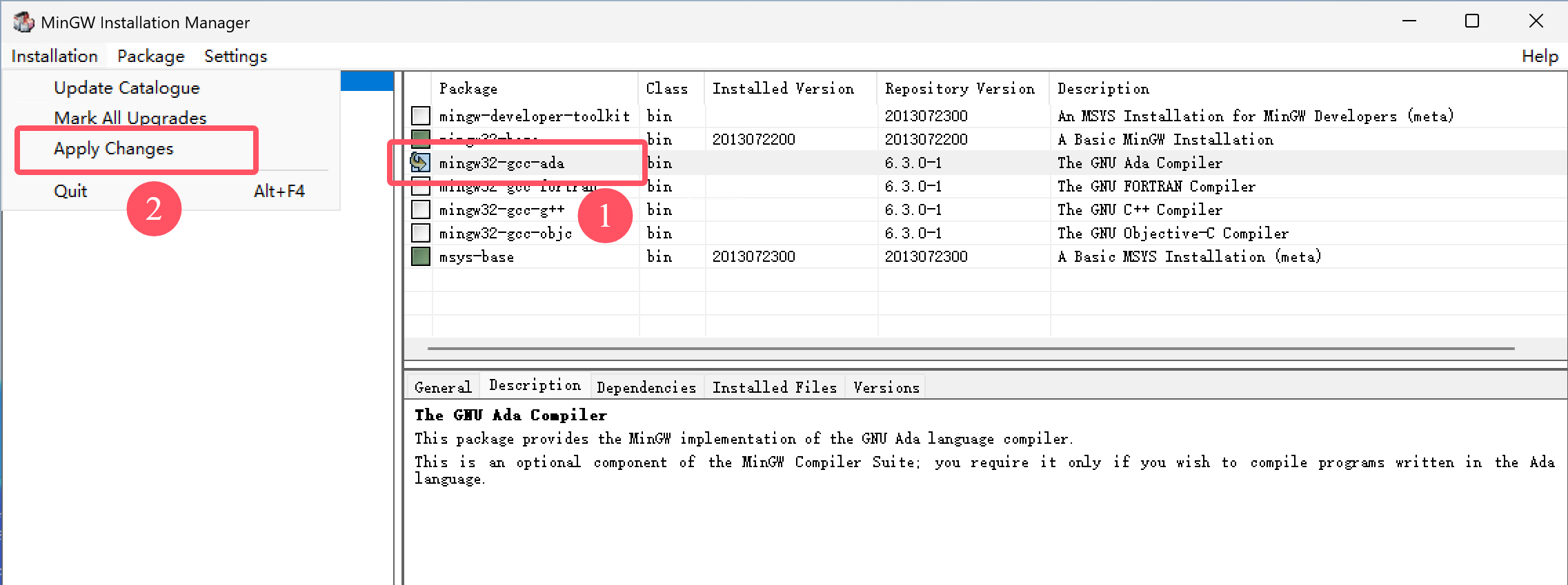 正确选择之后,效果如图①所示,会有一个箭头,然后点击左上角的“Installation”,再在二级菜单中选择“Apply Changes”,这个时候就会弹出一个窗口,正在下载相关的组件