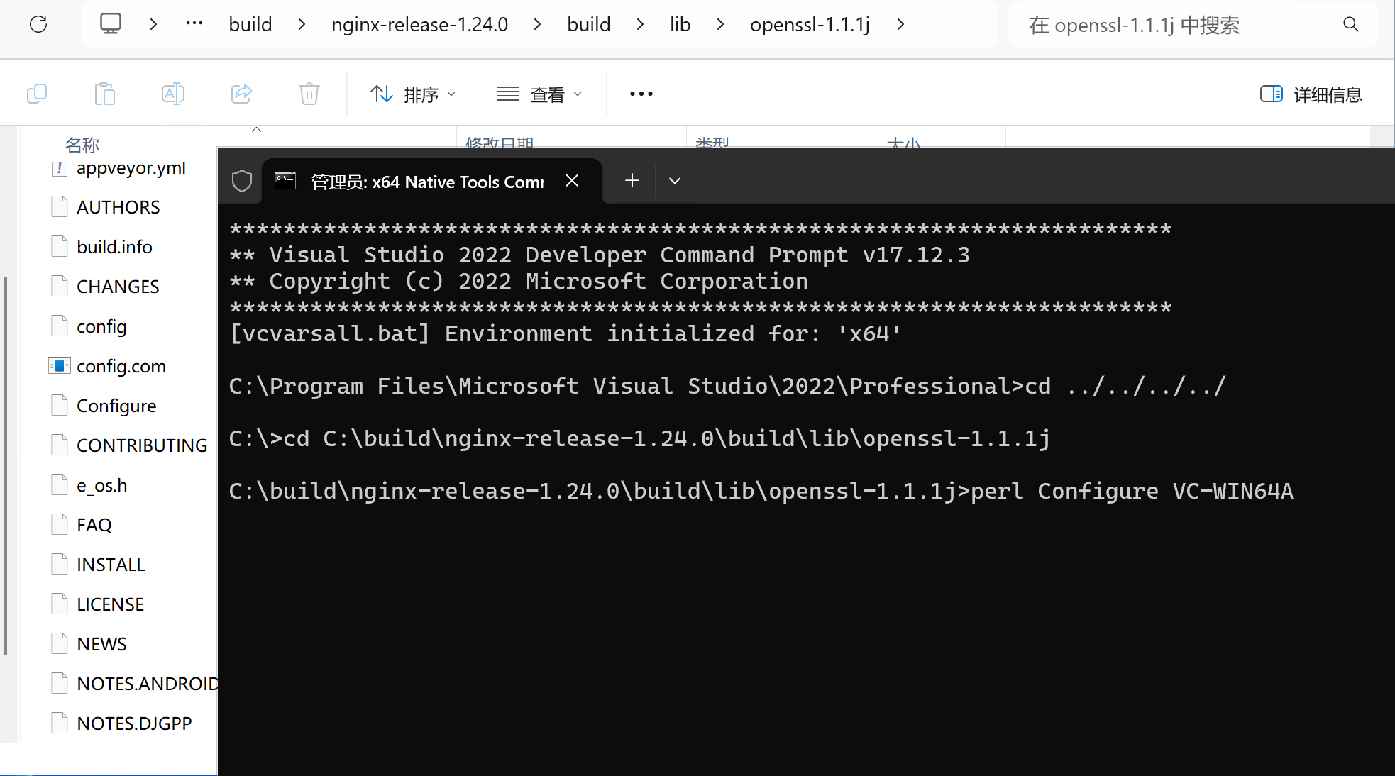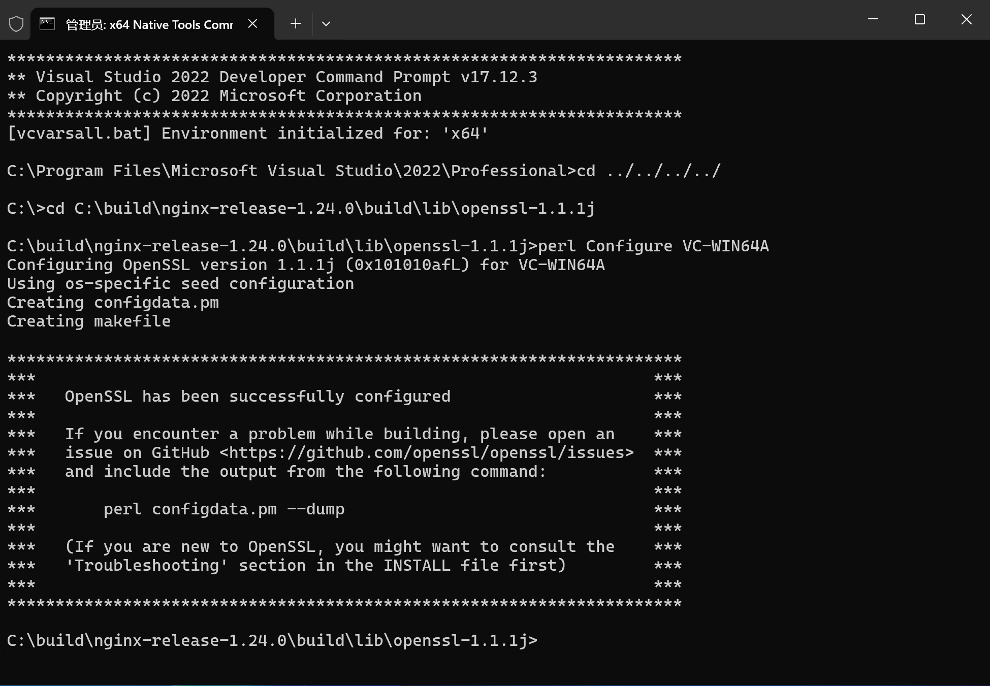 以管理员身份打开x64 Native Tools Command Prompt for VS 2022 命令行工具,切换到openssl的源代码根目录,然后运行相关指令,成功运行之后效果如下图所示