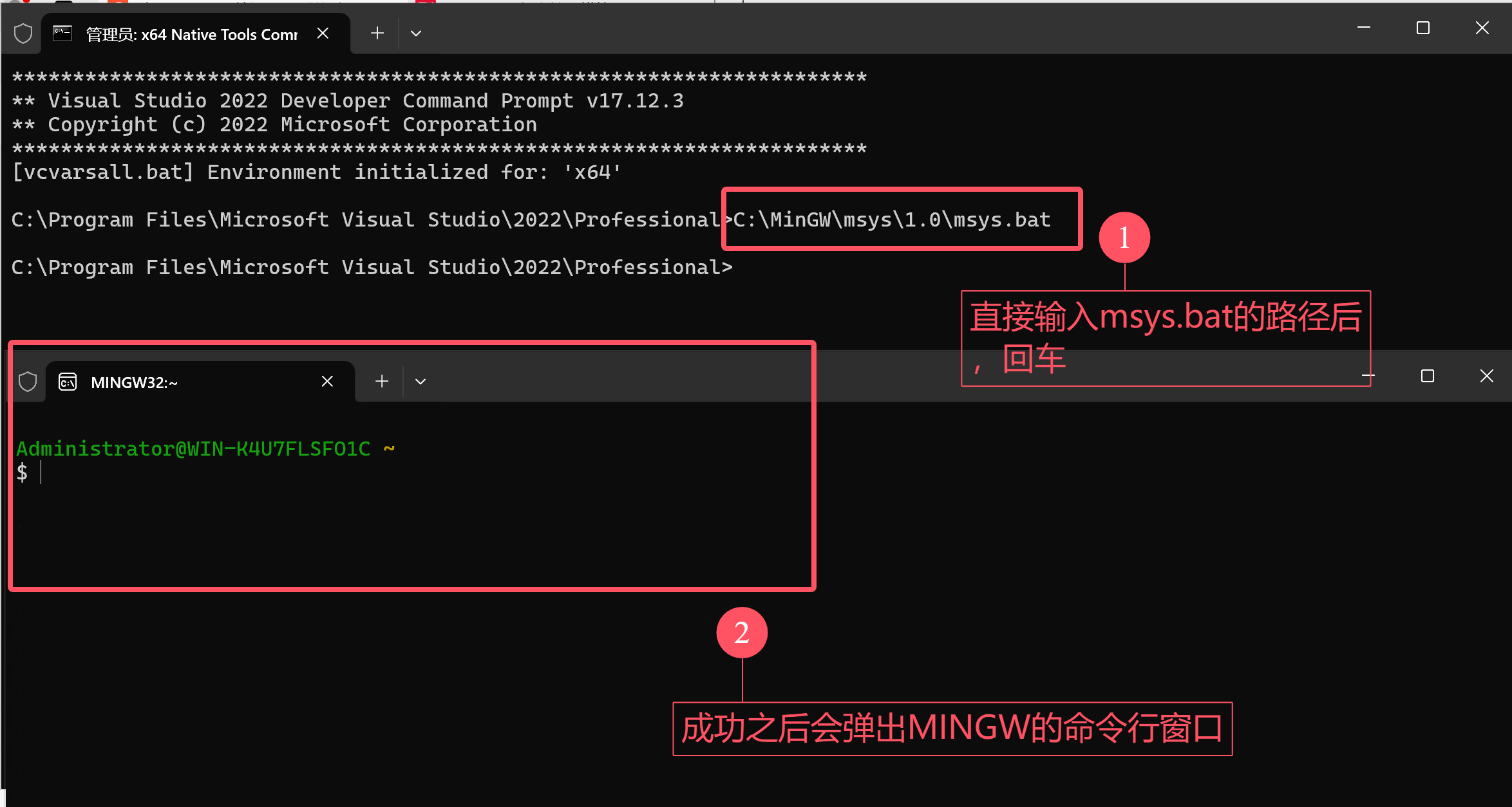 以管理员身份打开x64 Native Tools Command Prompt for VS 2022 命令行工具,切换到msys.bat所在的目录,这个文件所在的路径跟你当时安装MSYS的路径有关,默认安装的话,路径是:”C:\MinGW\msys\1.0\msys.bat”