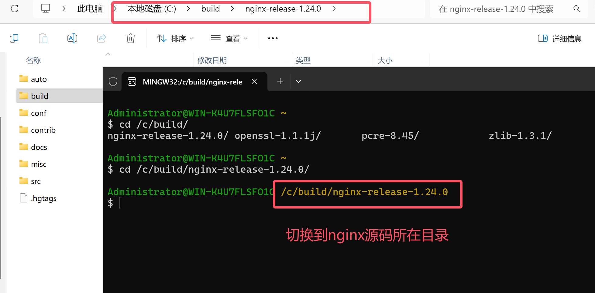 在MINGW32的命令行窗口中使用Linux的命令切换到nginx源码所在目录