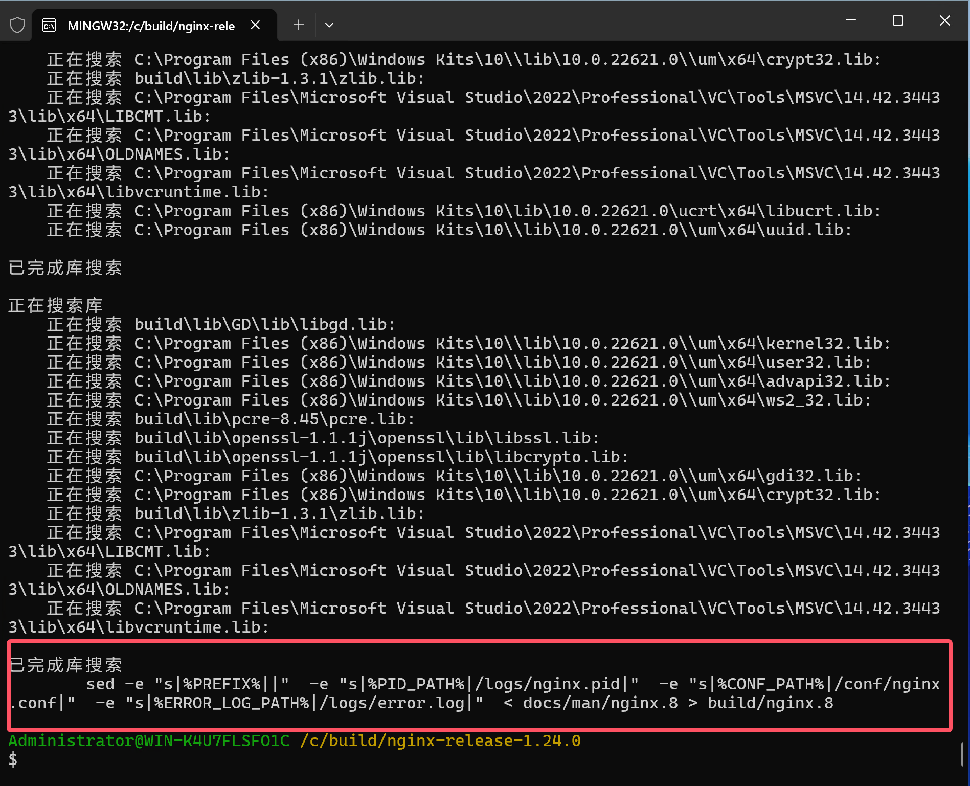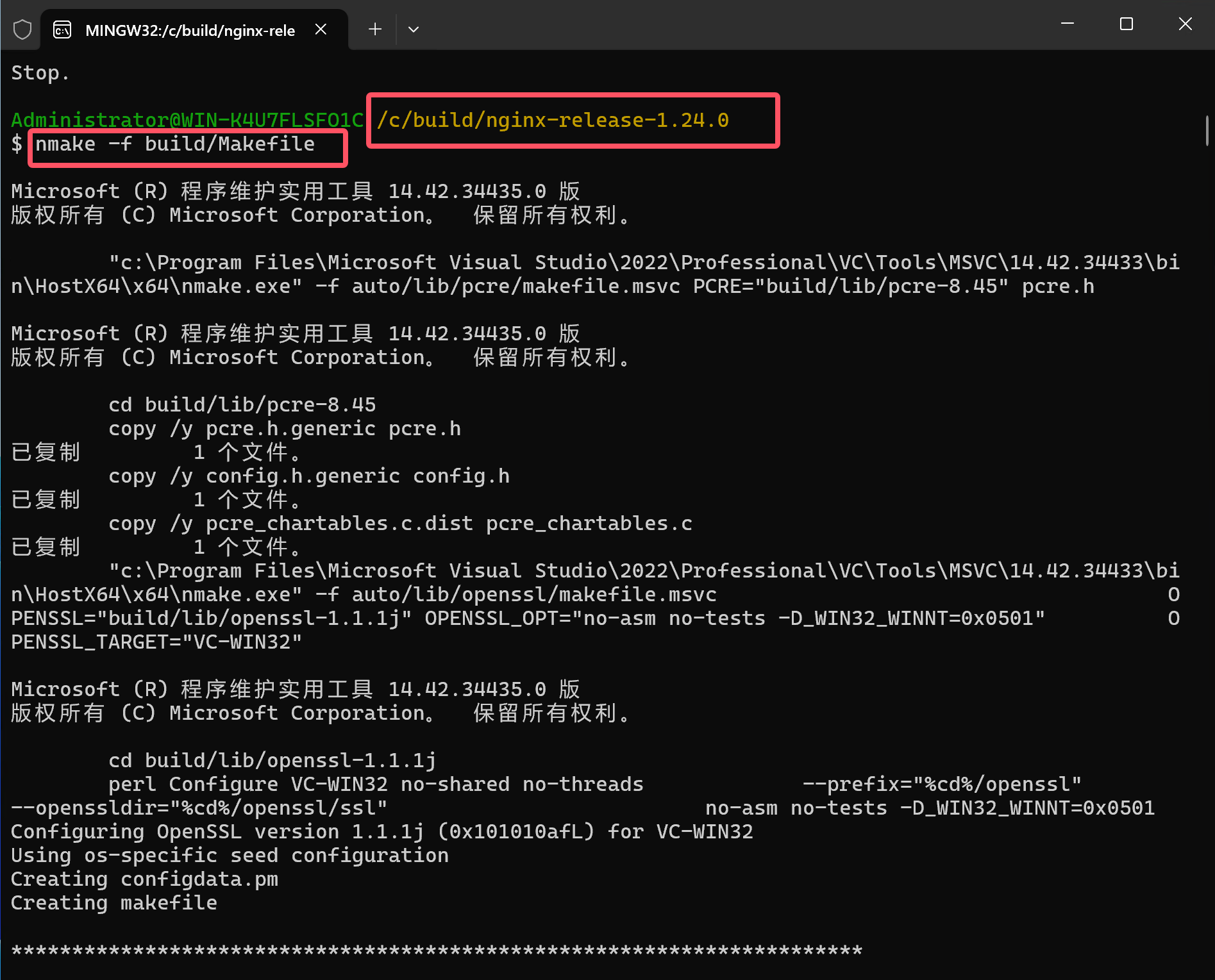 使用已经打开的x64 Native Tools Command Prompt for VS 2022 命令行工具或者重新管理员身份打开一个新的x64 Native Tools Command Prompt for VS 2022 命令行窗口,切换目录到nginx源码目录下,然后执行 nmake -f build/Makefile ,等待编译完成!!