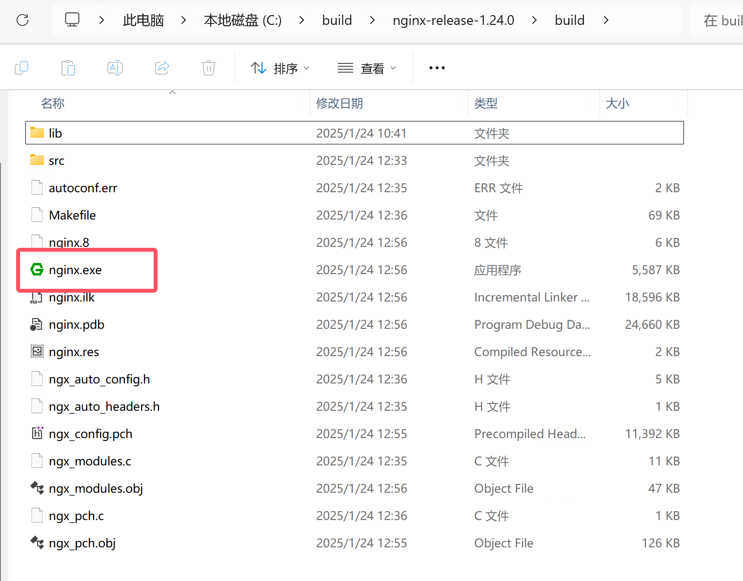成功编译之后如下图所示,此时可以在build目录中看到编译完成的nginx.exe文件!!