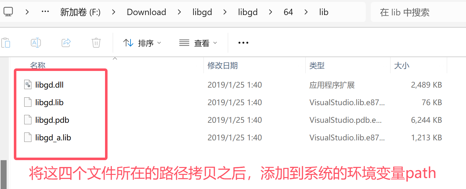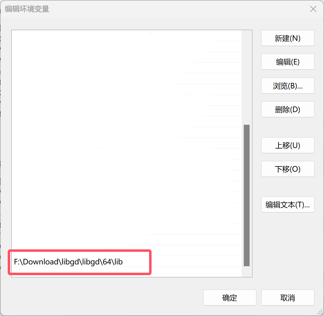此时,需要将我们之前编译好的libgd.dll动态链接库添加到系统变量当中